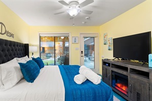 King 4 is a tranquil retreat featuring a King Tempur-Pedic adjustable mattress, an inviting electric fireplace, and a private walk-out patio with a view of the pool and outdoor oasis. With a cozy ambiance, plush bedding, and thoughtful amenities.