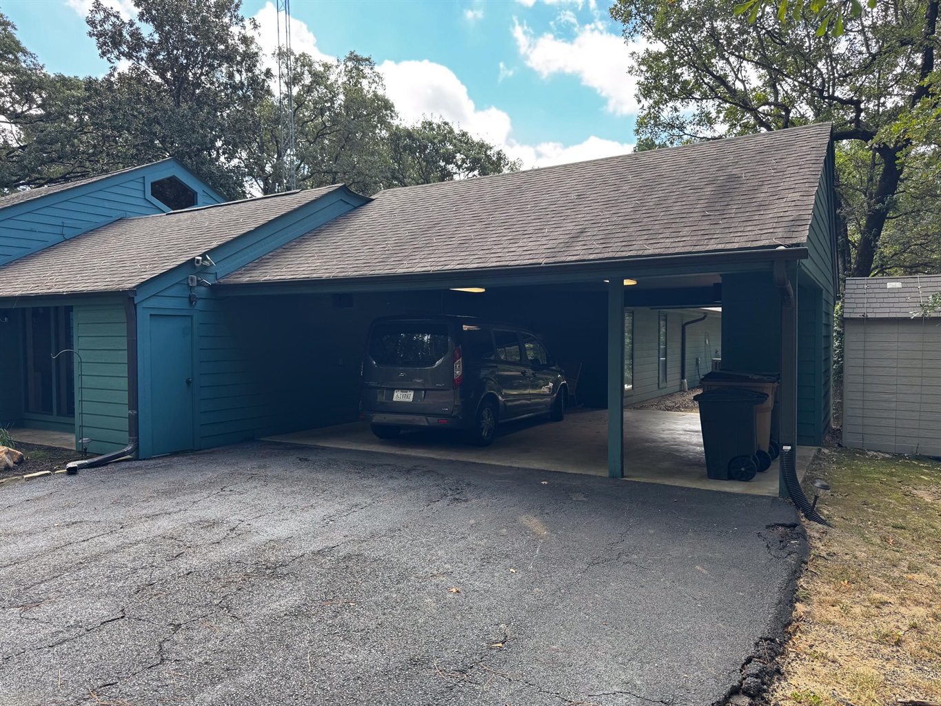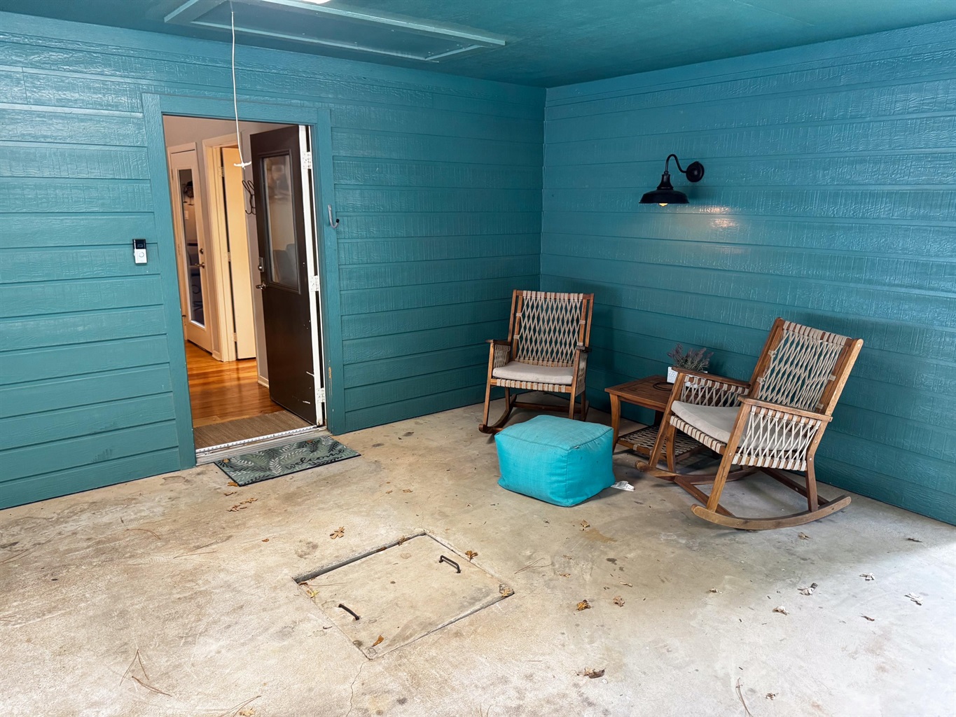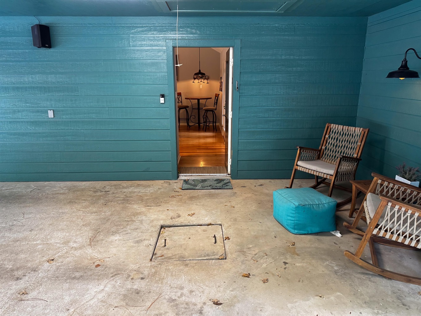 A cozy seating area on the two-car carport, perfect for unwinding. With rustic rocking chairs, warm lighting, and a peaceful ambiance, this inviting spot is ideal for enjoying a quiet moment outdoors.