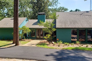 Welcome to Teal Paradise! The lush front yard features greenery, double doors, and step-free access, blending beauty and accessibility—setting a serene tone for the comfort inside.