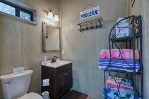 The pool house bathroom is stocked with plenty of beach towels for all guests and a "forgot it" basket filled with essentials like a first aid kit, blow dryer, and tissues, ensuring convenience and comfort by the pool.