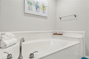 King 1 bathroom with large soaker tub, perfect for a relaxing spa-like bath experience. Large walk in shower. Unwind in comfort and enjoy the serene ambiance of this luxurious bathroom feature