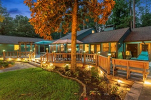 Sitting on the deck at night is pure magic. The soft glow of the exterior lighting creates a perfect balance—bright enough to see, yet dim enough to relax. Enjoy the massive deck's glider rocker, porch swing, hammock, and swivel chairs for ultimate comfort