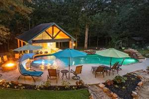 A dreamy nighttime retreat! This beautifully lit backyard features a sparkling pool, cozy fire pit, and a charming outdoor kitchen. Relax under the umbrellas or take a dip—perfect for unwinding in a serene setting.