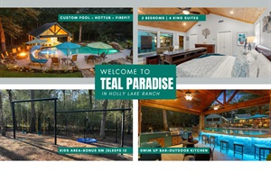 NEARBY: 🌲 Scenic Trails & Lakes – Within Walking Distance 🏌️♀️ Holly Lake Ranch Golf Course – On Site 🍽️ Holly Lake Ranch Restaurant – 1 Mile 🎣 Fishing & Kayaking – On Site 🏖️ Tyler State Park – 30 Miles 🍷 Los Pinos Ranch Vineyards – 20 Miles Whether you’re lounging poolside, exploring the trails, or gathering by the fire, Teal Paradise delivers an unforgettable East Texas experience.
